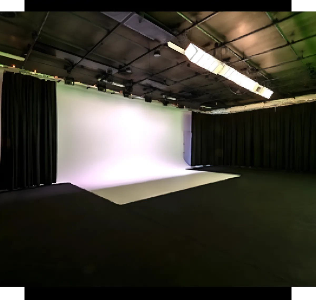 Black-box configurable soundstage with optional white or green cyc walls